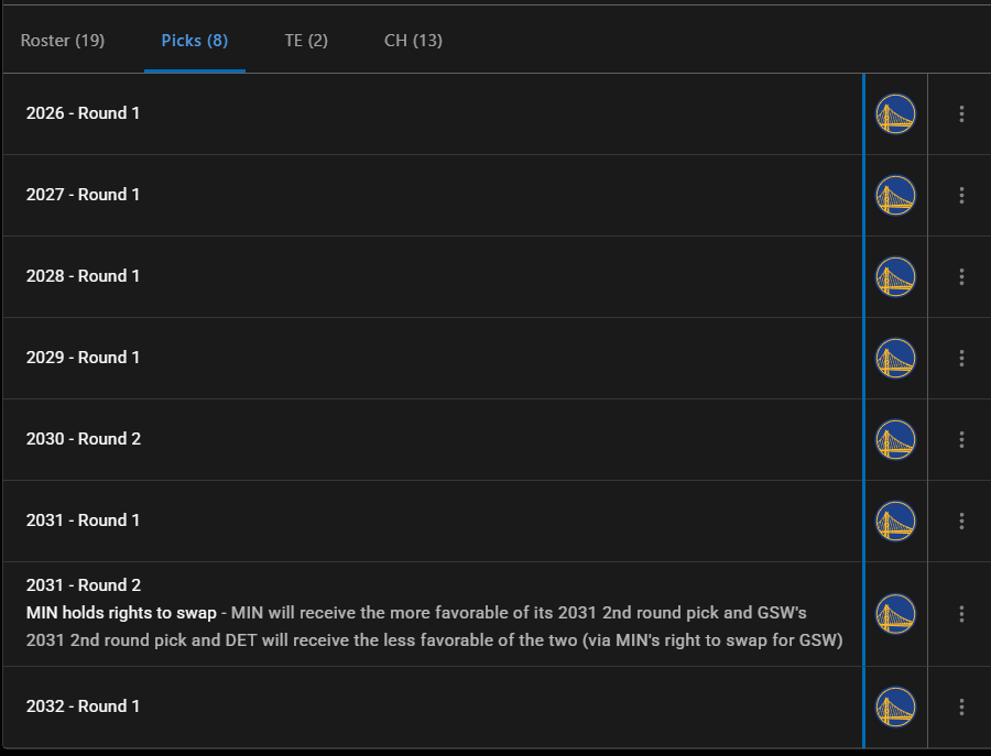 勇士手中只有26年、27年、28年、29年、31年、32年的首轮签,也就是没有30年,所以目前勇士能交易的首轮签只有三个,换墨菲要送两个后,直到2032年只有4个首轮签,勇士队会愿意吗?